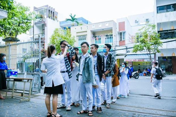 Sau kỳ nghỉ dài để phòng chống dịch Covid-19, học sinh lớp 12 ở Đà Nẵng bắt đầu quay trở lại trường học và các em được đo thân nhiệt trước khi vào lớp.